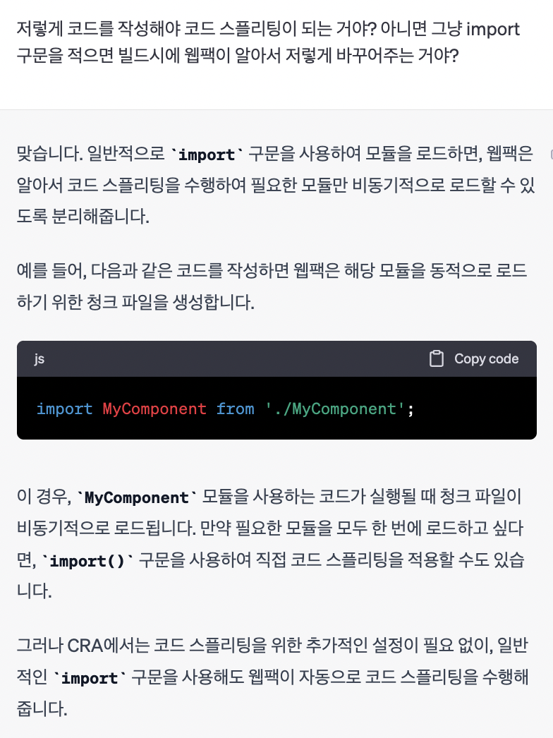 이때 webpack은 동기적으로 로드할 청크 파일을 생성합니다.